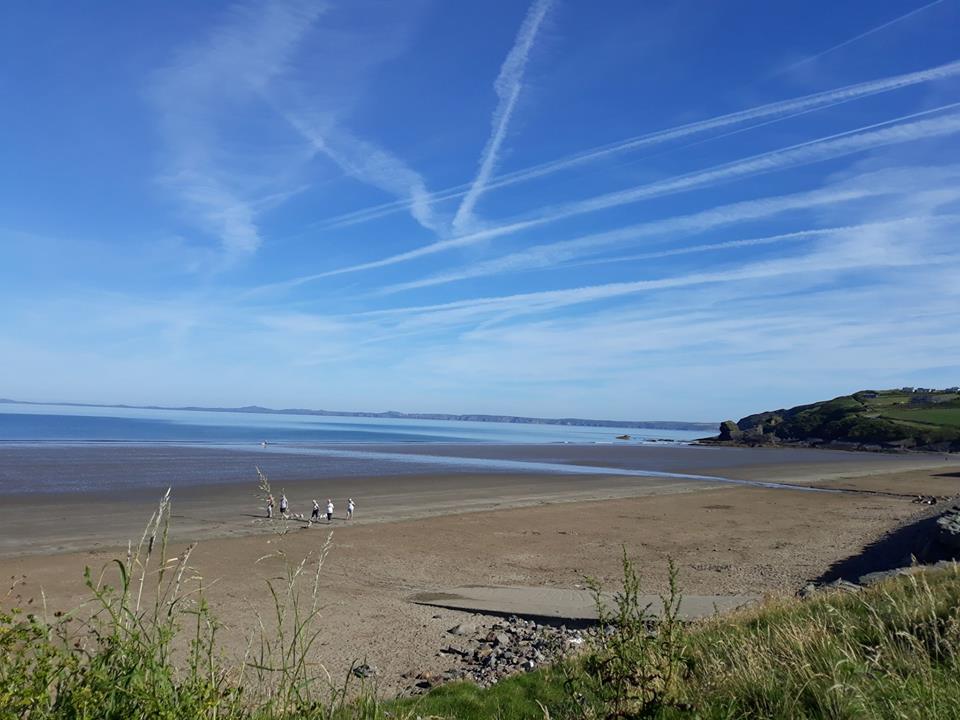 Vapour trails criss-cross the blue sky over Broad Haven beach