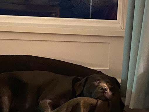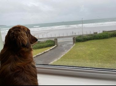 Eira the Dachshund looking longingly at the beach from apartment 2